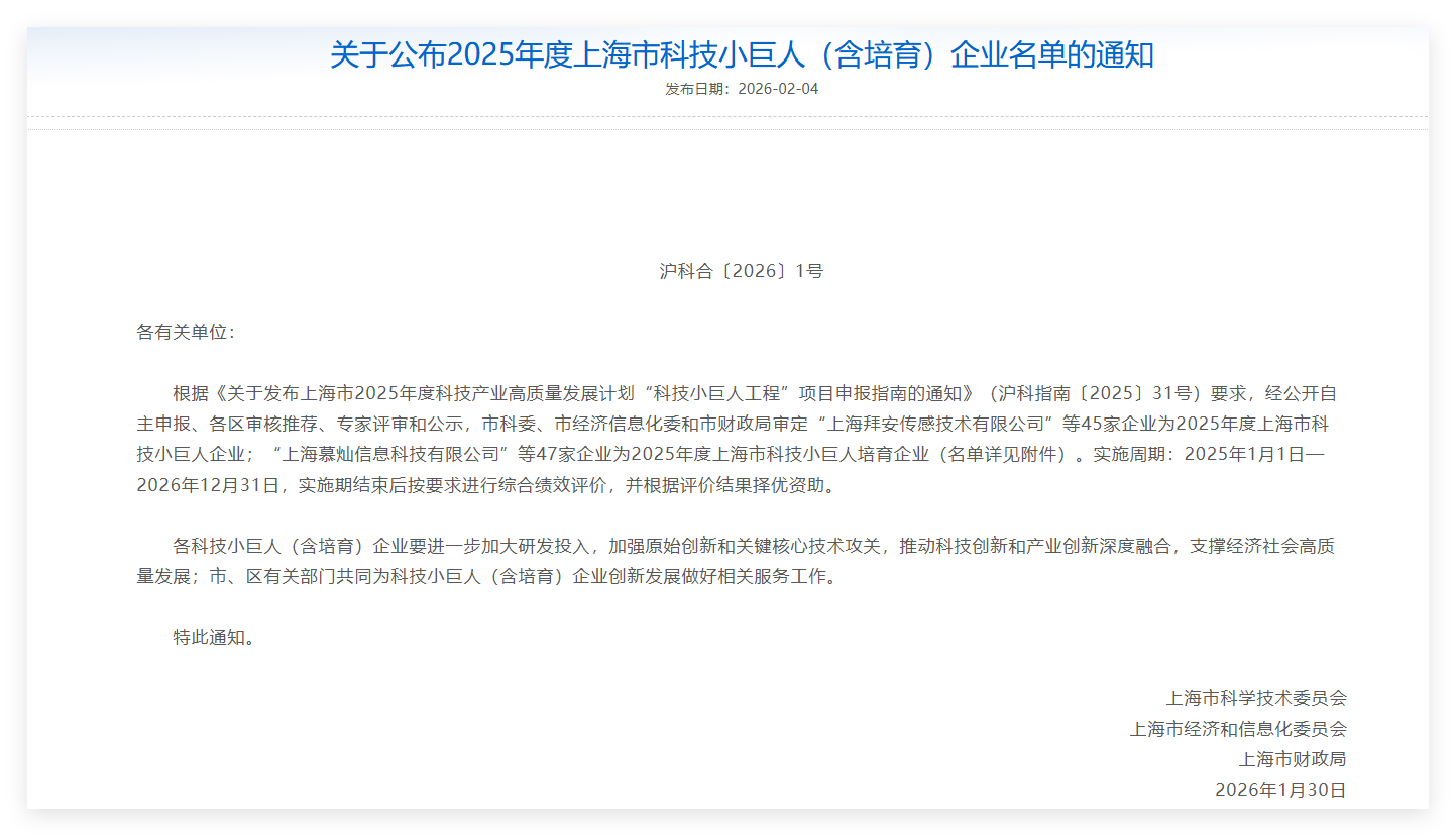 近日,我司荣获由上海市科学技术委员会、上海市经济和信息化委员会、上海市财政局联合评审认定的“2025年度上海市科技小巨人企业”称号。